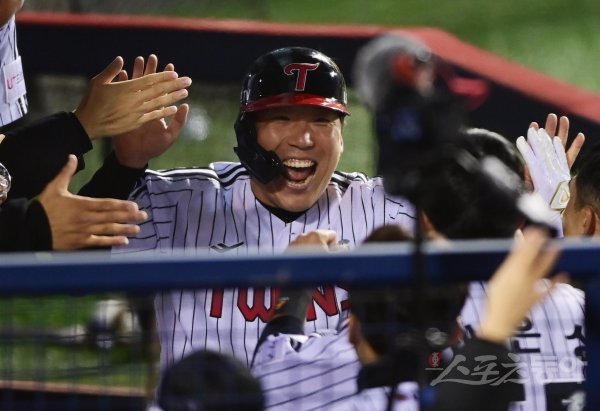 24일 서울 잠실야구장에서 열린 ‘2022 신한은행 SOL KBO리그’ 플레이오프 1차전 LG 트윈스와 키움 히어로즈의 경기에서 3회말 2사 1, 3루 LG의 뜬공 때 키움의 실책으로 득점에 성공한 3루주자 김현수가 환호하고 있다.