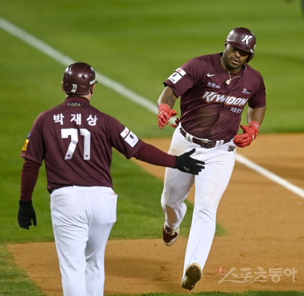 신한은행 MY CAR KBO리그‘ 플레이오프 1차전 키움 히어로즈와 LG 트윈스 경기가 열렸다. 6회초 2사 1루 키움 푸이그가 중월 투런 홈런을 날리고 그라운드를 돌며 하이파이브 하고 있다.