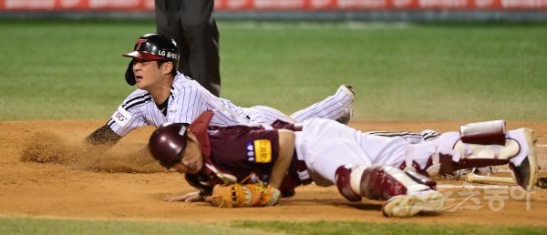 24일 서울 잠실야구장에서 열린 ‘2022 신한은행 SOL KBO리그’ 플레이오프 1차전 LG 트윈스와 키움 히어로즈의 경기에서 6회말 1사 3루 LG의 내야 땅볼 때 3루주자 오지환이 홈으로 파고들어 세이프 되고 있다.
