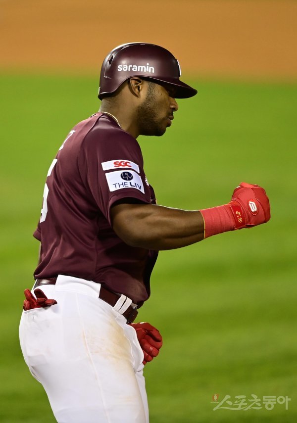 24일 서울 잠실야구장에서 열린 ‘2022 신한은행 SOL KBO리그’ 플레이오프 1차전 LG 트윈스와 키움 히어로즈의 경기에서 6회초 2사 1루 키움 푸이그가 좌월 투런 홈런을 친 후 세리머니를 하고 있다.