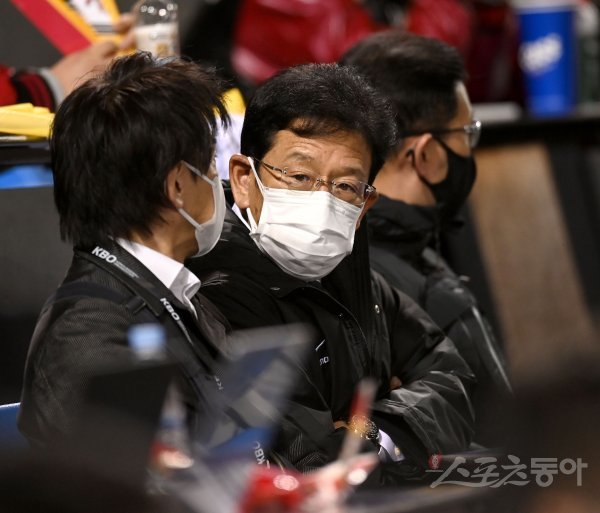 24일 서울 잠실야구장에서 ‘2022 신한은행 MY CAR KBO리그’ 플레이오프 1차전 키움 히어로즈와 LG 트윈스 경기가 열렸다. 일본 야구대표팀 구리야마 히데키 감독이 관전을 하고 있다. 잠실 | 김종원 기자 won@donga.com