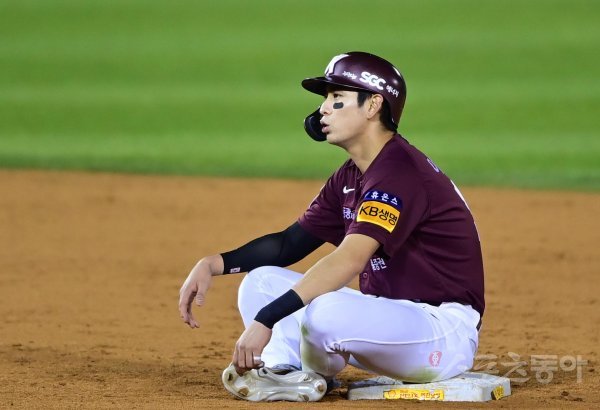 24일 서울 잠실야구장에서 열린 ‘2022 신한은행 SOL KBO리그’ 플레이오프 1차전 LG 트윈스와 키움 히어로즈의 경기에서 8회초 2사 2루 상황에서 LG의 투수 교체 때 키움 이정후가 2루 베이스에 앉아 숨을 돌리고 있다.