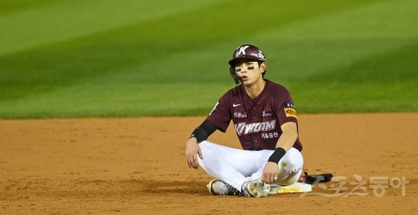 24일 서울 잠실야구장에서 ‘2022 신한은행 MY CAR KBO리그’ 플레이오프 1차전 키움 히어로즈와 LG 트윈스 경기가 열렸다. 8회초 1사 1,2루 LG 투수 교체 때 키움 2루주자 이정후가 베이스에 앉아 있다.