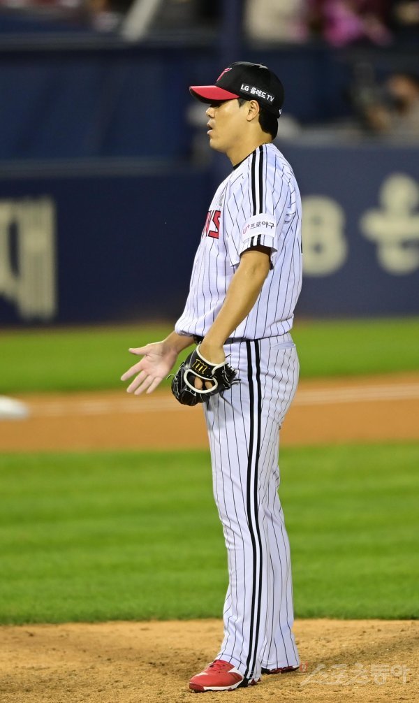 24일 서울 잠실야구장에서 열린 ‘2022 신한은행 SOL KBO리그’ 플레이오프 1차전 LG 트윈스와 키움 히어로즈의 경기에서 8회초 무사 1루 LG 김진성이 볼 판정에 어필하고 있다.