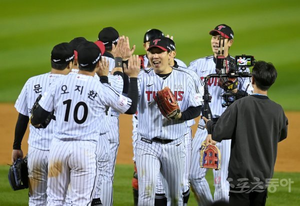 24일 서울 잠실야구장에서 ‘2022 신한은행 MY CAR KBO리그’ 플레이오프 1차전 키움 히어로즈와 LG 트윈스 경기가 열렸다. 6-3 승리를 거둔 LG 선수들이 하이파이브 하고 있다.