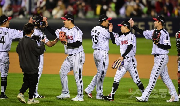 24일 서울 잠실야구장에서 열린 ‘2022 신한은행 SOL KBO리그’ 플레이오프 1차전 LG 트윈스와 키움 히어로즈의 경기에서 6-3으로 승리한 LG 선수들이 기쁨을 나누고 있다.