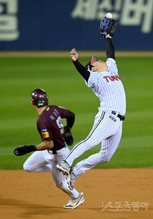 LG 문보경(오른쪽)은 24일 잠실구장에서 벌어진 키움과 PO 1차전에서 공수에 걸친 맹활약으로 팀의 6-3 승리를 이끌었다. 3회초 2사 2·3루서 김혜성의 뜬공 타구를 가까스로 잡아내고 있는 문보경. 잠실 | 김종원 기자 won@donga.com