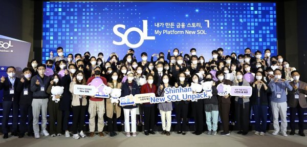 신한은행이 금융 앱의 패러다임을 고객 중심으로 전환한 ‘뉴 쏠’을 공개했다. 뉴 쏠 언팩 행사에서 신한은행 고객자문단과 기념