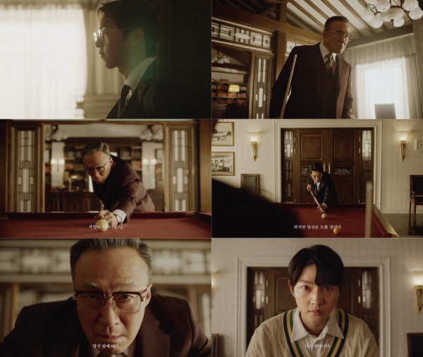 공개된 ‘죽었다 깨어나도’ 티저 영상에는 두 남자의 맹렬한 전쟁을 함축한 당구판으로 호기심을 자극한다. 담담한 표정으로 진양철(이성민 분)이 마련한 게임에 입성한 이는 윤현우다. 이윽고 진양철의 가뿐한 손짓과 함께 게임은 시작된다. ‘죽었다 깨어나도 이길 수 없을’ 것 같았던 상대인 만큼, 휘몰아치는 진양철의 공격은 위기감을 높인다.