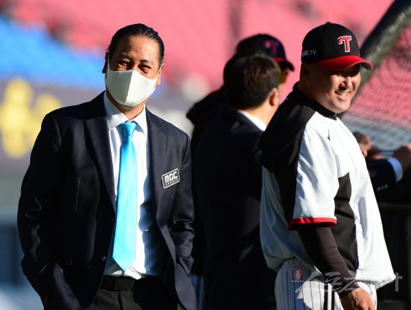 25일 서울 잠실야구장에서 열린 ‘2022 신한은행 SOL KBO리그’ 플레이오프 2차전 LG 트윈스와 키움 히어로즈의 경기에 앞서 이상훈 해설위원과 LG 조인성 코치가 인사하고 있다.