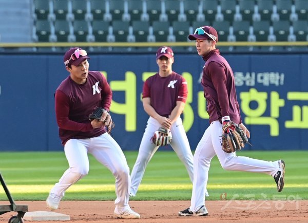 25일 서울 잠실야구장에서 열린 ‘2022 신한은행 SOL KBO리그’ 플레이오프 2차전 LG 트윈스와 키움 히어로즈의 경기에 앞서 키움 김휘집과 김혜성이 수비 훈련을 하고 있다.