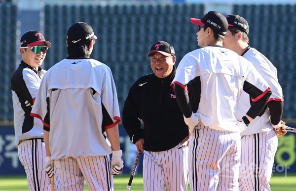 25일 서울 잠실야구장에서 열린 ‘2022 신한은행 SOL KBO리그’ 플레이오프 2차전 LG 트윈스와 키움 히어로즈의 경기에 앞서 LG 김호 코치, 박해민과 선수들이 이야기를 하고 있다.