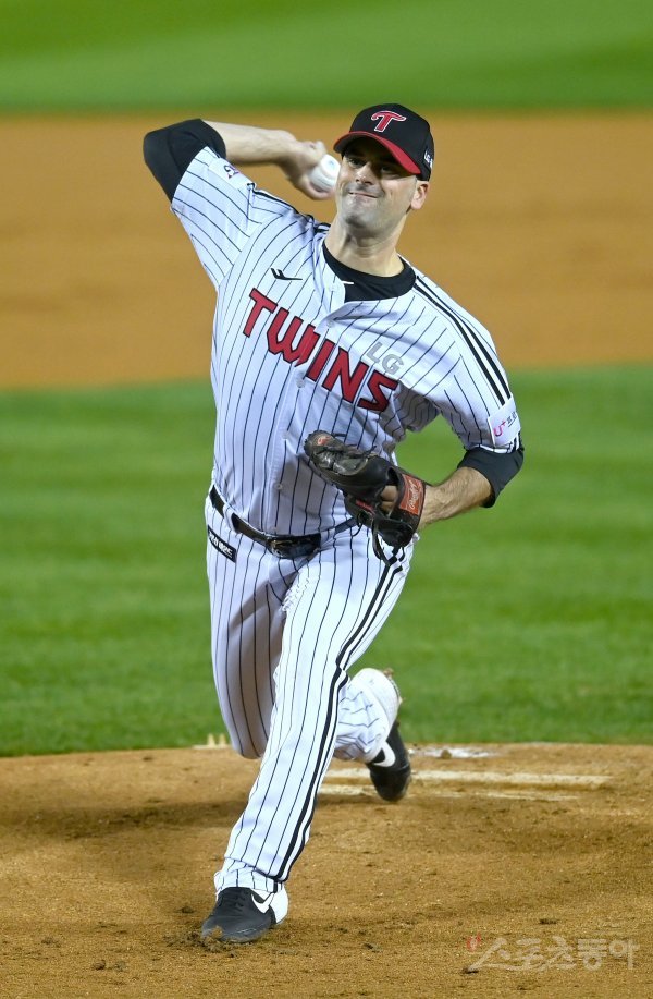 25일 서울 잠실야구장에서 ‘2022 신한은행 MY CAR KBO리그’ 플레이오프 2차전 키움 히어로즈와 LG 트윈스 경기가 열렸다. 선발 투수로 등판한 LG 플럿코가 역투하고 있다.