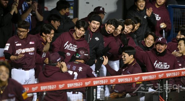 25일 서울 잠실야구장에서 ‘2022 신한은행 MY CAR KBO리그’ 플레이오프 2차전 키움 히어로즈와 LG 트윈스 경기가 열렸다. 2회초 2사 2루 키움 안타 때 득점한 이정후가 하이파이브 하고 있다.