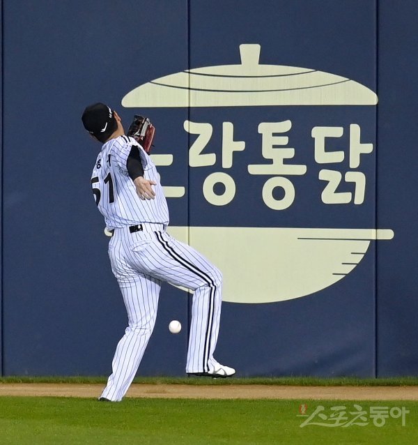 25일 서울 잠실야구장에서 ‘2022 신한은행 MY CAR KBO리그’ 플레이오프 2차전 키움 히어로즈와 LG 트윈스 경기가 열렸다. 2회초 2사 1루 LG 홍창기가 펜스까지 달려갔으나 키움 이정후의 타구를 놓치고 있다.