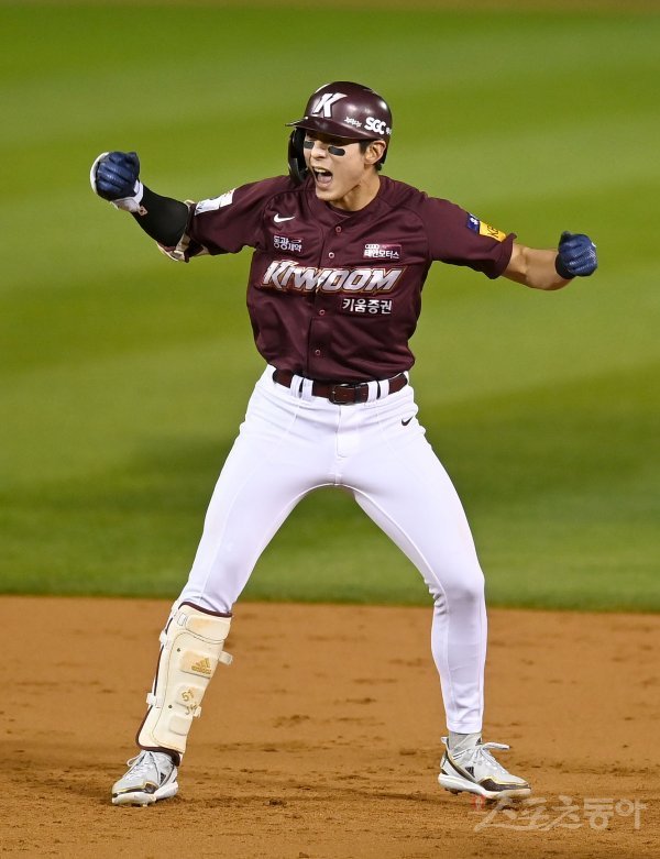 25일 서울 잠실야구장에서 ‘2022 신한은행 MY CAR KBO리그’ 플레이오프 2차전 키움 히어로즈와 LG 트윈스 경기가 열렸다. 2회초 2사 1루 키움 이정후가 1타점 우전 2루타를 치고 2루에서 환호하고 있다.