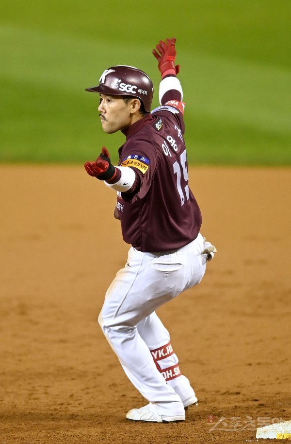 25일 서울 잠실야구장에서 ‘2022 신한은행 MY CAR KBO리그’ 플레이오프 2차전 키움 히어로즈와 LG 트윈스 경기가 열렸다. 2회초 2사 2,3루 키움 이용규가 2타점 적시타를 치고 1루에서 기뻐하고 있다.