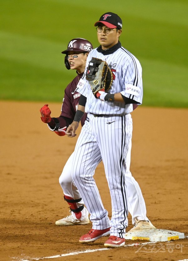 25일 서울 잠실야구장에서 ‘2022 신한은행 MY CAR KBO리그’ 플레이오프 2차전 키움 히어로즈와 LG 트윈스 경기가 열렸다. 2회초 1사 2루 키움 송성문이 1타점 적시타를 치고 1루에서 환호하고 있다.