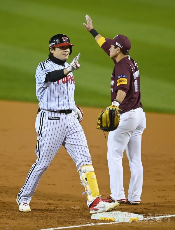 25일 서울 잠실야구장에서 ‘2022 신한은행 MY CAR KBO리그’ 플레이오프 2차전 키움 히어로즈와 LG 트윈스 경기가 열렸다. 1회말 1사 LG 이형종이 좌전 안타를 치고 1루에서 기뻐하고 있다.