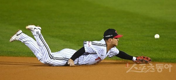 25일 서울 잠실야구장에서 ‘2022 신한은행 MY CAR KBO리그’ 플레이오프 2차전 키움 히어로즈와 LG 트윈스 경기가 열렸다. 1회초 1사 1루 LG 김민성이 다이빙캐치를 시도했으나 놓치고 있다.