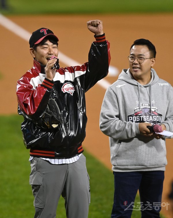 25일 서울 잠실야구장에서 ‘2022 신한은행 MY CAR KBO리그’ 플레이오프 2차전 키움 히어로즈와 LG 트윈스 경기가 열렸다. 시구자로 나선 탤런트 이종혁이 화이팅을 외치고 있다.