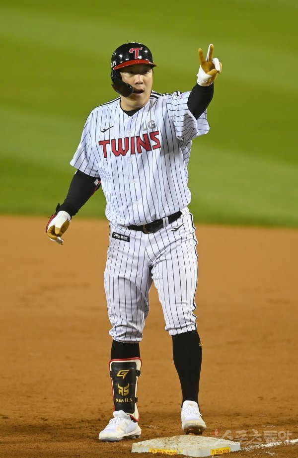25일 서울 잠실야구장에서 ‘2022 신한은행 MY CAR KBO리그’ 플레이오프 2차전 키움 히어로즈와 LG 트윈스 경기가 열렸다. 3회말 무사 1루 LG 김현수가 우전 안타를 치고 1루에서 기뻐하고 있다.