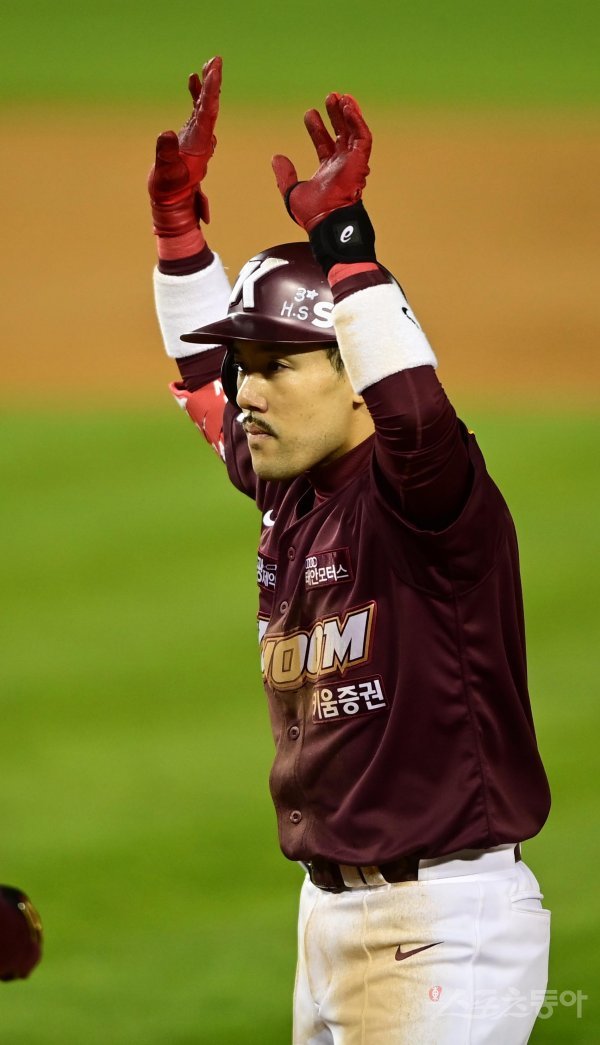 25일 서울 잠실야구장에서 열린 ‘2022 신한은행 SOL KBO리그’ 플레이오프 2차전 LG 트윈스와 키움 히어로즈의 경기에서 2회초 2사 2, 3루 키움 이용규가 2타점 우전 적시타를 친 후 세리머니를 하고 있다.