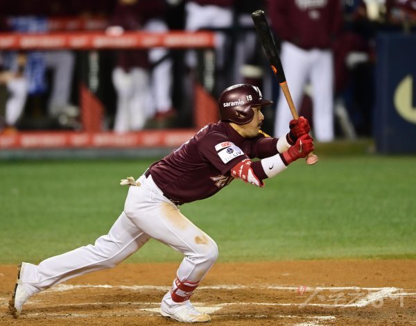 25일 서울 잠실야구장에서 열린 ‘2022 신한은행 SOL KBO리그’ 플레이오프 2차전 LG 트윈스와 키움 히어로즈의 경기에서 2회초 2사 2, 3루 키움 이용규가 2타점 우전 적시타를 치고 있다.