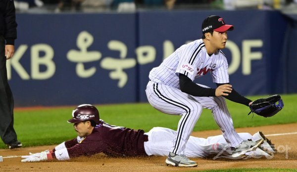 25일 서울 잠실야구장에서 열린 ‘2022 신한은행 SOL KBO리그’ 플레이오프 2차전 LG 트윈스와 키움 히어로즈의 경기에서 1회초 1사 1루 키움의 우전 안타 때 1루주자 이용규가 3루로 파고들어 세이프 되고 있다.
