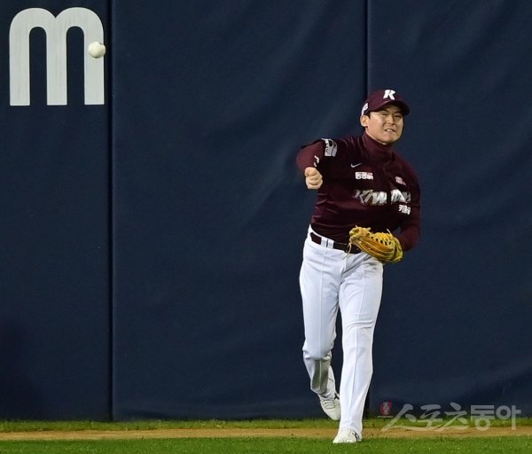 25일 서울 잠실야구장에서 열린 ‘2022 신한은행 SOL KBO리그’ 플레이오프 2차전 LG 트윈스와 키움 히어로즈의 경기에서 3회말 1사 1, 2루 LG의 좌전 적시타 때 포구 실책을 범한 키움 김준완이 송구하고 있다.