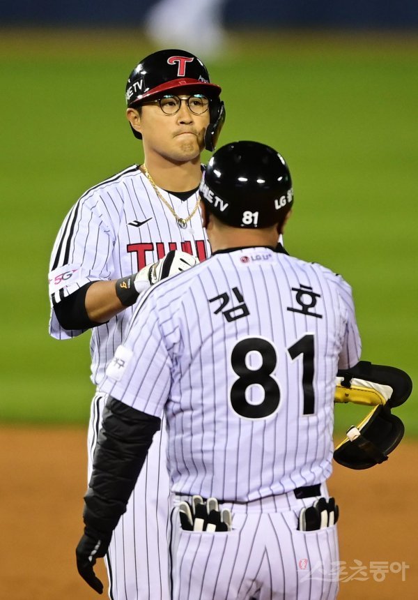 25일 서울 잠실야구장에서 열린 ‘2022 신한은행 SOL KBO리그’ 플레이오프 2차전 LG 트윈스와 키움 히어로즈의 경기에서 3회말 1사 1, 2루 LG 채은성이 1타점 좌전 2루타 친 후 1루코치와 주먹을 맞대고 있다.