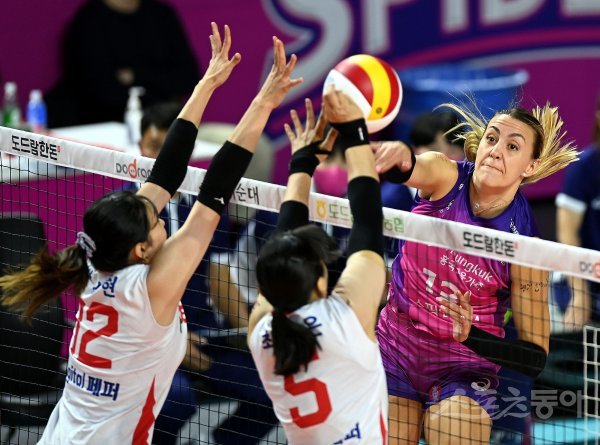 25일 인천 삼산월드체육관에서 ‘2022-2023 도드람 V리그’ 인천 흥국생명과 광주 페퍼저축은행의 여자부 경기가 열렸다. 흥국생명 옐레나가 페퍼저축은행 블로커를 피해 스파이크를 날리고 있다.