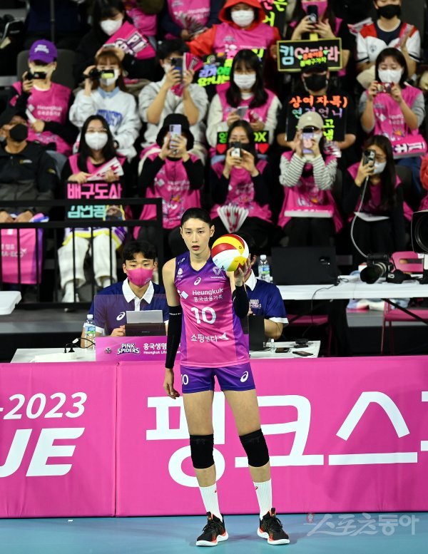 25일 인천 삼산월드체육관에서 ‘2022-2023 도드람 V리그’ 인천 흥국생명과 광주 페퍼저축은행의 여자부 경기가 열렸다. 흥국생명 김연경이 서브를 준비하자 배구팬들이 응원을 펼치고 있다.