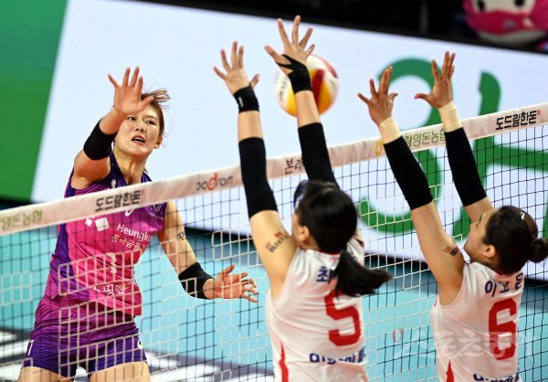 25일 인천 삼산월드체육관에서 ‘2022-2023 도드람 V리그’ 인천 흥국생명과 광주 페퍼저축은행의 여자부 경기가 열렸다. 흥국생명 김다은이 페퍼저축은행 블로커를 피해 스파이크를 날리고 있다.
