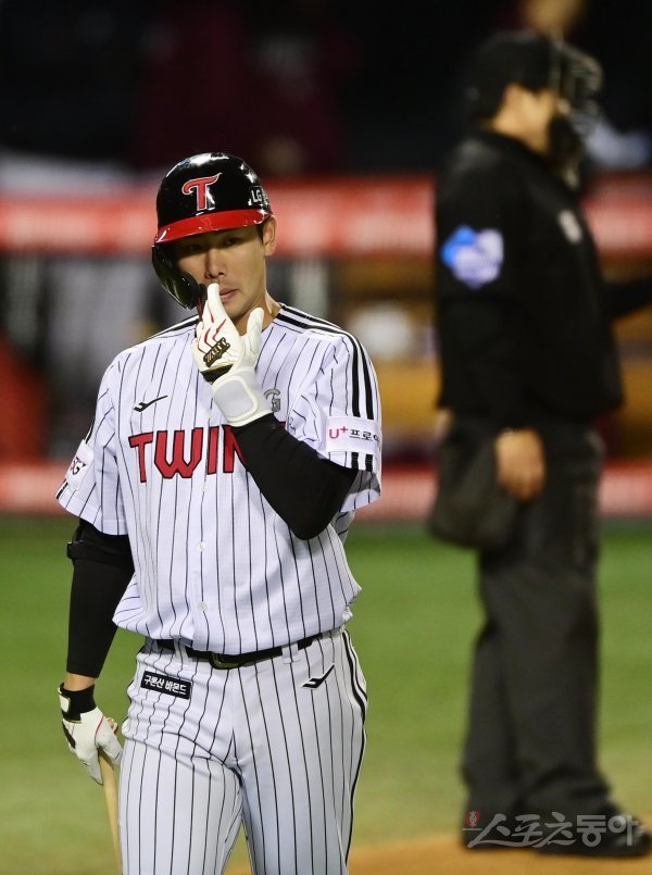 25일 서울 잠실야구장에서 열린 ‘2022 신한은행 SOL KBO리그’ 플레이오프 2차전 LG 트윈스와 키움 히어로즈의 경기에서 4회말 무사 LG 홍창기가 삼진 아웃을 당한 후 아쉬워하고 있다.
