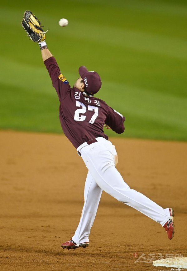 25일 서울 잠실야구장에서 ‘2022 신한은행 MY CAR KBO리그’ 플레이오프 2차전 키움 히어로즈와 LG 트윈스 경기가 열렸다. 5회말 무사 1루 LG 내야 땅볼 때 키움 김태진이 악송구 된 공을 놓치고 있다.
