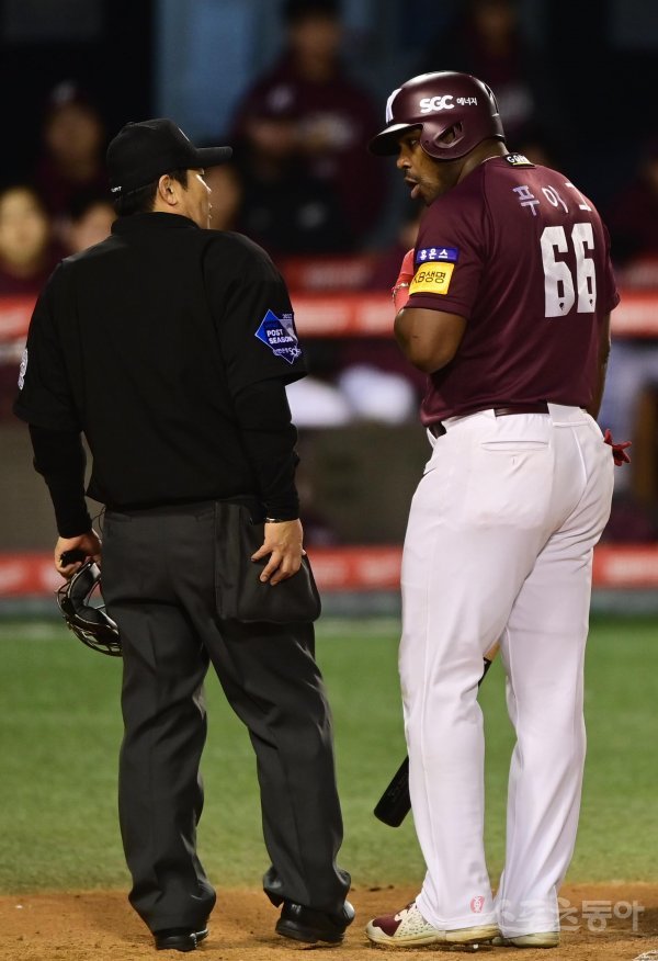 25일 서울 잠실야구장에서 열린 ‘2022 신한은행 SOL KBO리그’ 플레이오프 2차전 LG 트윈스와 키움 히어로즈의 경기에서 6회초 1사 3루 키움 푸이그가 삼진 아웃을 당한 후 심판에게 어필하고 있다.