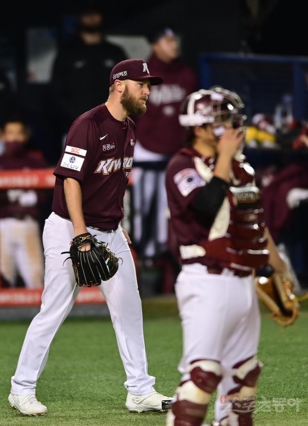 25일 서울 잠실야구장에서 열린 ‘2022 신한은행 SOL KBO리그’ 플레이오프 2차전 LG 트윈스와 키움 히어로즈의 경기에서 5회말 무사 1루 LG의 땅볼 때 송수 실책을 범한 키움 요키시가 아쉬워하고 있다.