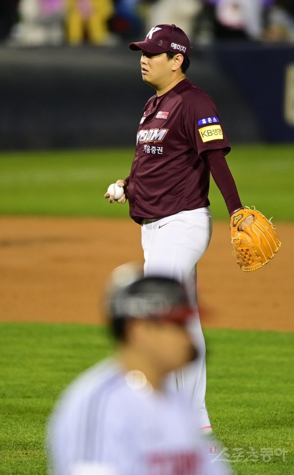 25일 서울 잠실야구장에서 열린 ‘2022 신한은행 SOL KBO리그’ 플레이오프 2차전 LG 트윈스와 키움 히어로즈의 경기에서 5회말 1사 만루 LG에 밀어내기 볼넷으로 실점한 키움 양현이 아쉬워하고 있다.
