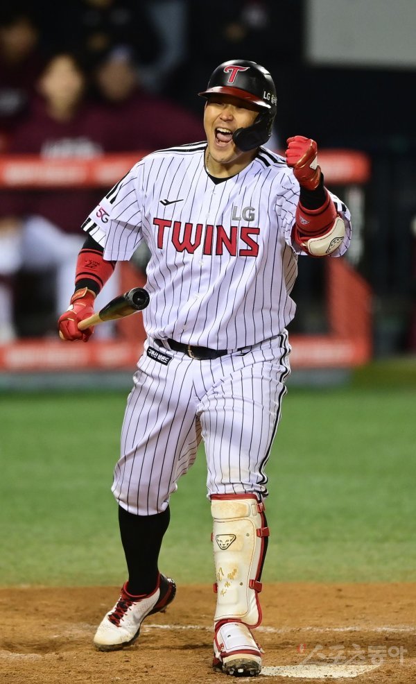 25일 서울 잠실야구장에서 열린 ‘2022 신한은행 SOL KBO리그’ 플레이오프 2차전 LG 트윈스와 키움 히어로즈의 경기에서 5회말 1사 만루 LG 유강남이 밀어내기 볼넷을 얻어낸 후 기뻐하고 있다.
