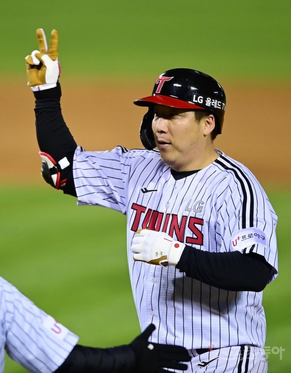 25일 서울 잠실야구장에서 열린 ‘2022 신한은행 SOL KBO리그’ 플레이오프 2차전 LG 트윈스와 키움 히어로즈의 경기에서 5회말 무사 2루 LG 김현수가 1타점 우전 적시타를 친 후 세리머니를 하고 있다.