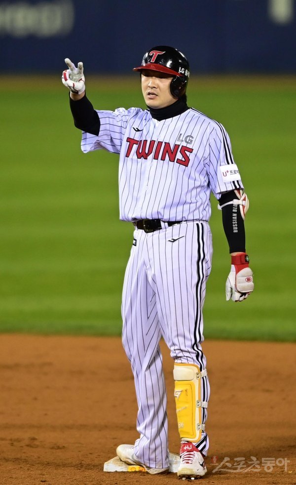25일 서울 잠실야구장에서 열린 ‘2022 신한은행 SOL KBO리그’ 플레이오프 2차전 LG 트윈스와 키움 히어로즈의 경기에서 5회말 무사 LG 이형종이 좌전 2루타를 친 후 더그아웃을 향해 세리머니 하고 있다.