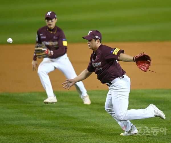 25일 서울 잠실야구장에서 ‘2022 신한은행 MY CAR KBO리그’ 플레이오프 2차전 키움 히어로즈와 LG 트윈스 경기가 열렸다. 6회말 2사 1루 LG 투수 앞 땅볼 때 키움 최원태가 포구 실책을 하고 있다.