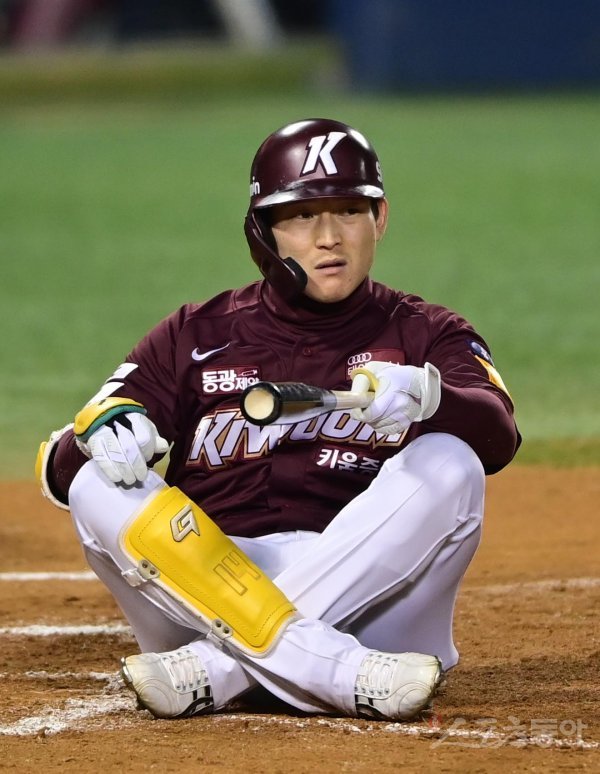 25일 서울 잠실야구장에서 열린 ‘2022 신한은행 SOL KBO리그’ 플레이오프 2차전 LG 트윈스와 키움 히어로즈의 경기에서 7회초 2사 1루 키움 김준완이 몸쪽으로 투구된 볼에 놀라 넘어졌다가 일어나고 있다.