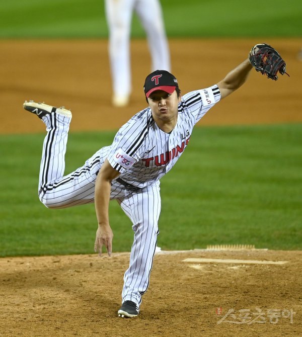 25일 서울 잠실야구장에서 ‘2022 신한은행 MY CAR KBO리그’ 플레이오프 2차전 키움 히어로즈와 LG 트윈스 경기가 열렸다. 8회초 2사 1,2루 상황에서 등판한 LG 고우석이 역투하고 있다.