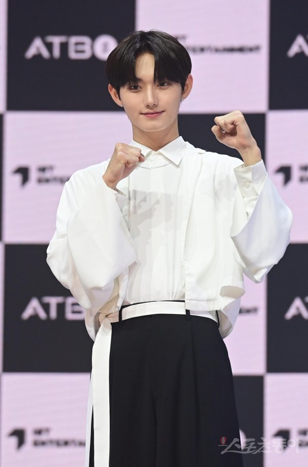 그룹 ATBO 원빈이 26일 서울 광진구 광장동 예스24 라이브홀에서 열린 2번째 미니앨범 ‘The Beginning : 始作(시작)’ 발매 기념 프레스 쇼케이스에서 포즈를 취하고 있다.