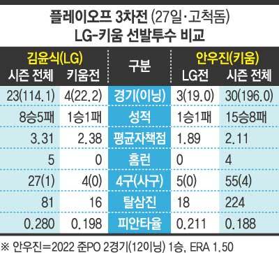 LG와 키움은 3차전 선봉장을 영건들에게 맡겼다. LG는 좌완 김윤식(22), 키움은 우완 안우진(23)을 선발투수로 내세운다. 김윤식은 올해 포스트시즌(PS) 첫 등판이고, 안우진은 22일 KT 위즈와 준PO 5차전 선발등판 이후 4일만 쉬고 다시 마운드에 오른다.