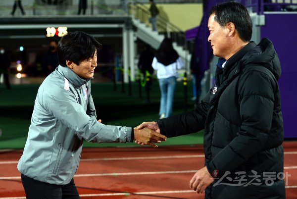 26일 경기도 안양종합운동장에서 열린 ‘하나원큐 K리그 2022’ 수원 삼성과 FC안양의 승강플레이오프 1차전 경기에서 수원 이병근 감독과 안양 이우형 감독이 악수를 나누고 있다.