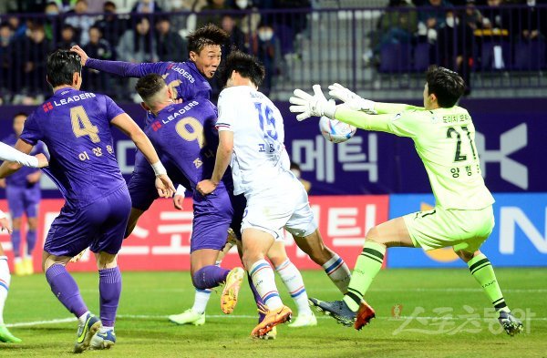 26일 경기도 안양종합운동장에서 열린 ‘하나원큐 K리그 2022’ 수원 삼성과 FC안양의 승강플레이오프 1차전 경기에서 안양 황기욱이 헤딩슛을 날리고 있다.