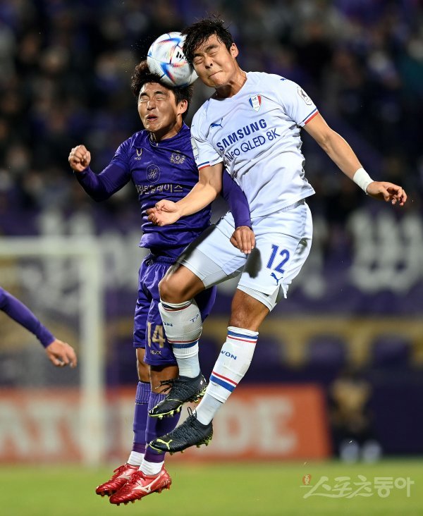 26일 경기도 안양종합운동장에서 열린 ‘하나원큐 K리그 2022’ 수원 삼성과 FC안양의 승강플레이오프 1차전 경기에서 안양 홍창범과 수원 강현묵이 공중볼을 다투고 있다.
